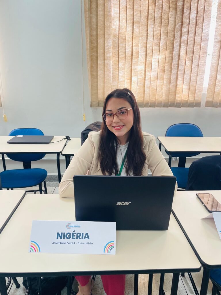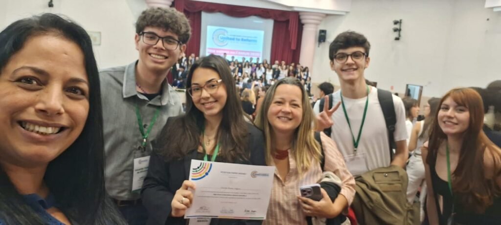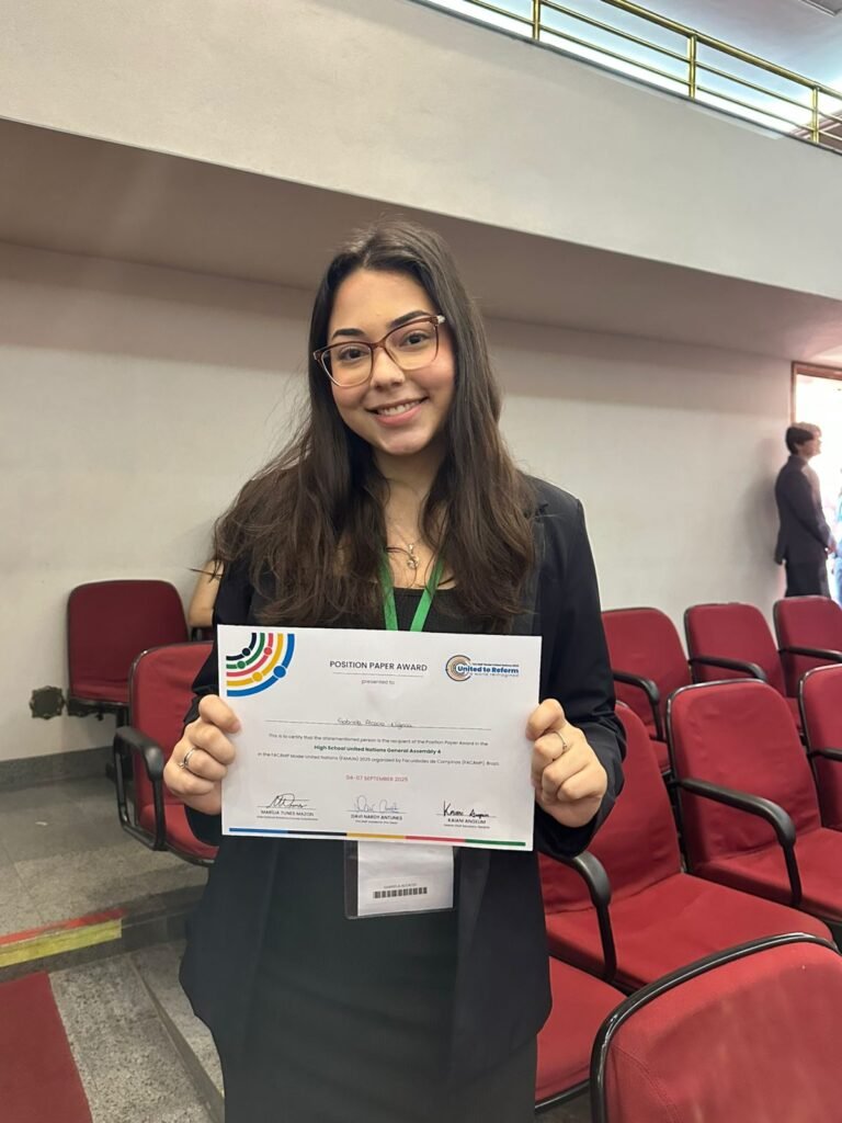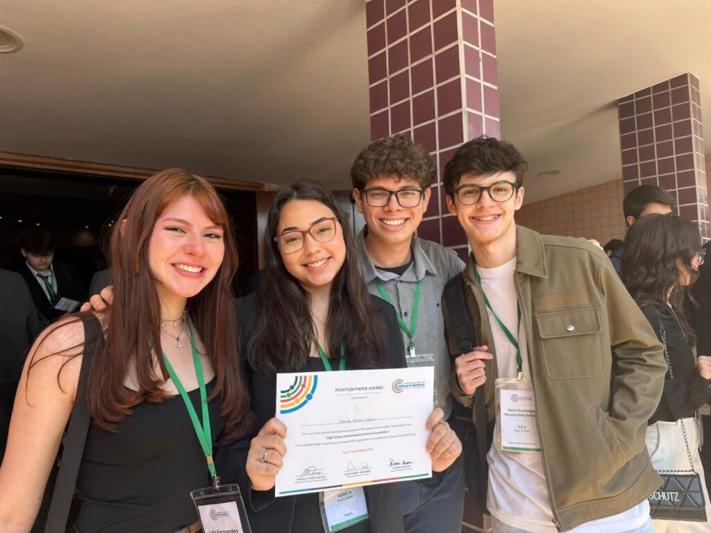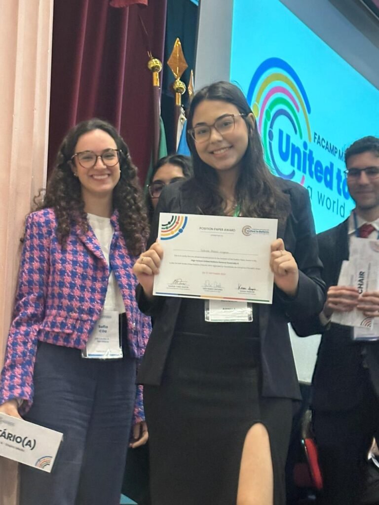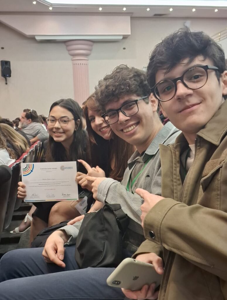 Os nossos alunos foram incríveis na sua participação, envolvimento e destaque em todas as vivências e para coroar esse evento tão especial, a aluna Gabriela recebeu o prêmio de melhor Position Paper, representando a Nigéria na simulação da Assembleia Geral das Nações Unidas.