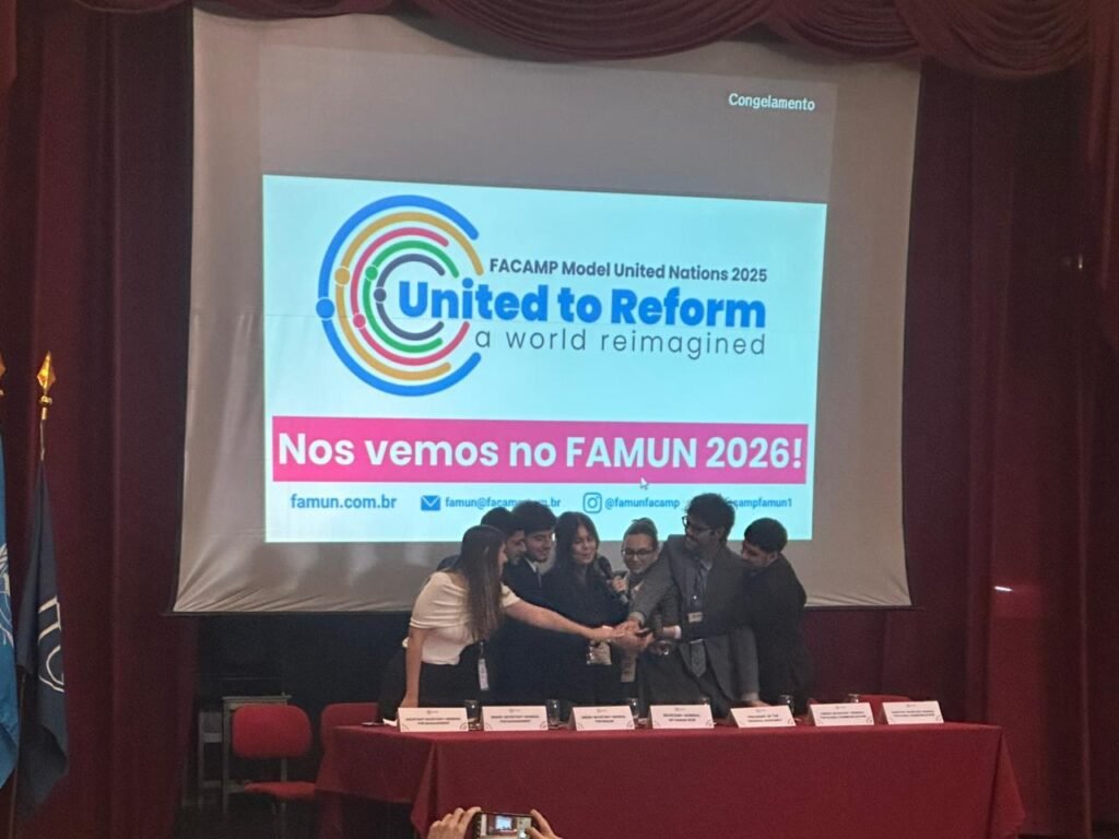 02/10/2025Entre os dias 4 a 7 de setembro de 2025, os alunos selecionados do 3º Ano do Ensino Médio, participaram do FAMUN (FACAMP Model United Nations), onde tiveram a oportunidade de reformular a Carta da ONU. Esta carta é o documento fundador da Organização das Nações Unidas, que estabelece os propósitos e princípios da Organização e foi criado em 1945, quando a ONU foi fundada. Em 2025, no ano em que a ONU completa seus 80 anos de existência, os alunos foram desafiados a repensar os desafios globais da atualidade, com foco para a garantia dos direitos humanos, sustentabilidade, mudanças climáticas, segurança alimentar e avanços tecnológicos.