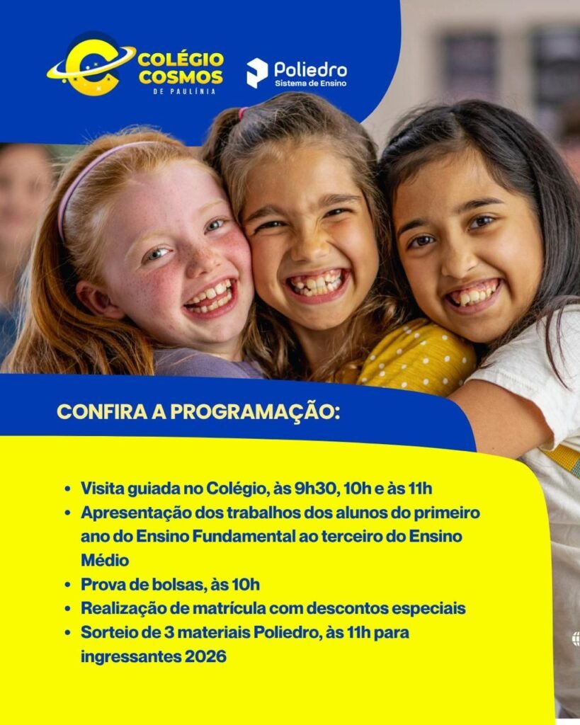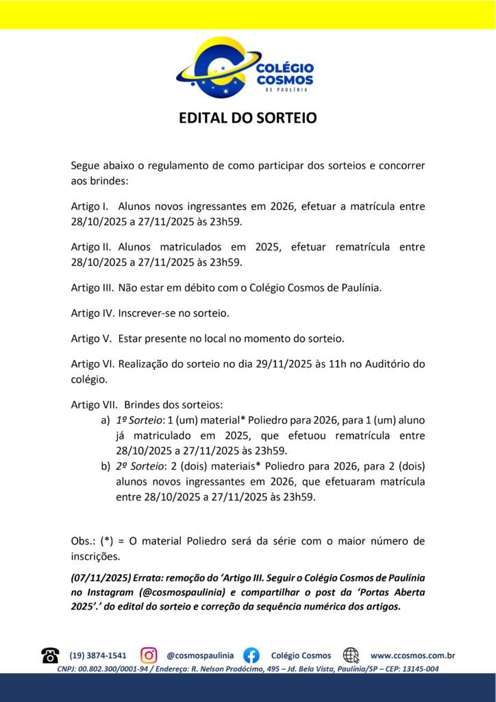 11/12/2025Na Escola Aberta – Portas Abertas 2025, haverá sorteios de materiais Poliedro para alunos que efetuarem matricula ou rematricula para 2026 entre os dias 28/10/2025 a 27/11/2025, conforme edital abaixo.