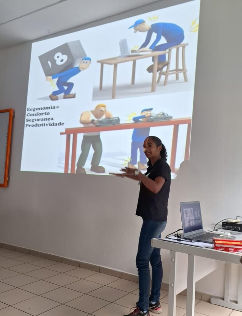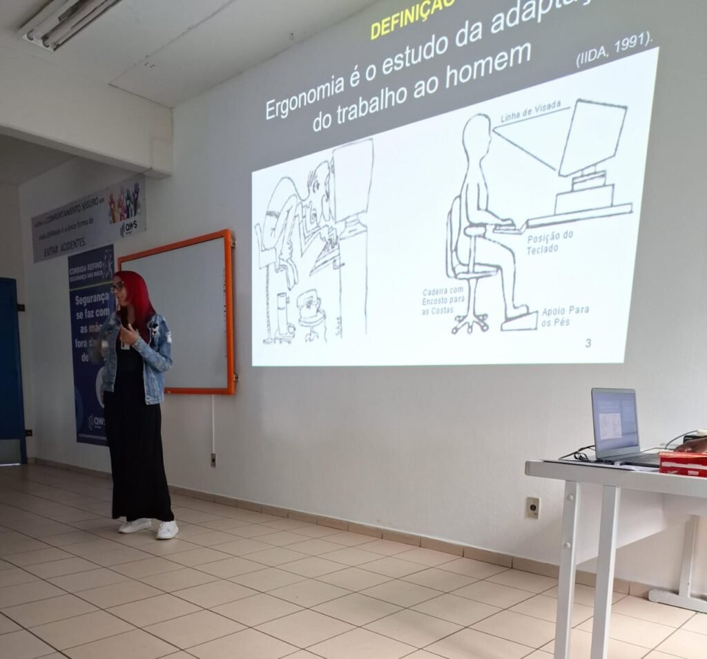 Na ocasião, os alunos tiveram a oportunidade de palestrar sobre Ergonomia, transmitindo informações relevantes referentes a qualidade de vida e bem estar de todos os trabalhadores.